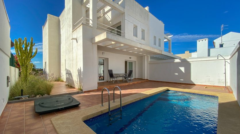 Via de voortuin komt u bij de voordeur die toegang geeft tot de hall die uitkomt in de woon-eetkamer met airco, openhaard en schuifdeuren naar het overdekte terras aan de achterzijde. Hier vindt u tevens het zwembad. Aan de voorzijde van deze woning treft u de volledig ingerichte keuken met deur naar de patio. Via de toog in de woonkamer bereikt u het gastentoilet met daarnaast een dubbele slaapkamer met vaste kasten en een badkamer met ligbad, dubbele wastafel, toilet en bidet.