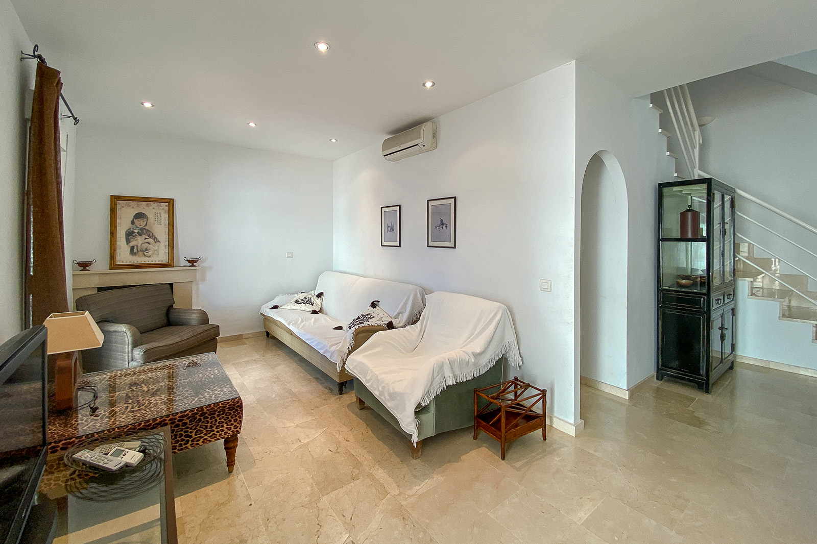 Via de voortuin komt u bij de voordeur die toegang geeft tot de hall die uitkomt in de woon-eetkamer met airco, openhaard en schuifdeuren naar het overdekte terras aan de achterzijde. Hier vindt u tevens het zwembad. Aan de voorzijde van deze woning treft u de volledig ingerichte keuken met deur naar de patio. Via de toog in de woonkamer bereikt u het gastentoilet met daarnaast een dubbele slaapkamer met vaste kasten en een badkamer met ligbad, dubbele wastafel, toilet en bidet.